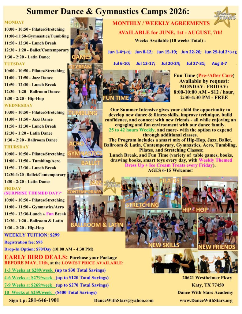 The Program includes a smart mix of Hip-Hop, Jazz, Ballet, Ballroom & Latin, Contemporary, Gymnastics, Acro, Tumbling, Pilates, and Stretching Classes.